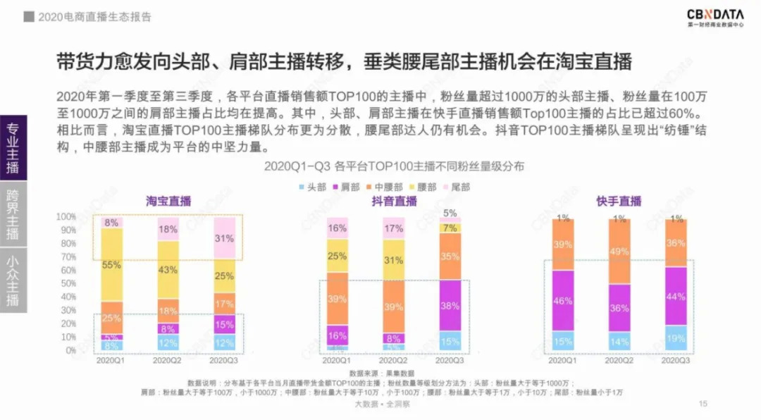 首先,直播平台业态更开放,为中小主播也带来了前景和机会。报告显示,在淘宝直播、抖音、快手三大平台,肩部主播、腰部主播逐渐成为中坚力量。三农主播、银发主播等小众主播也能发挥强劲带货力。
