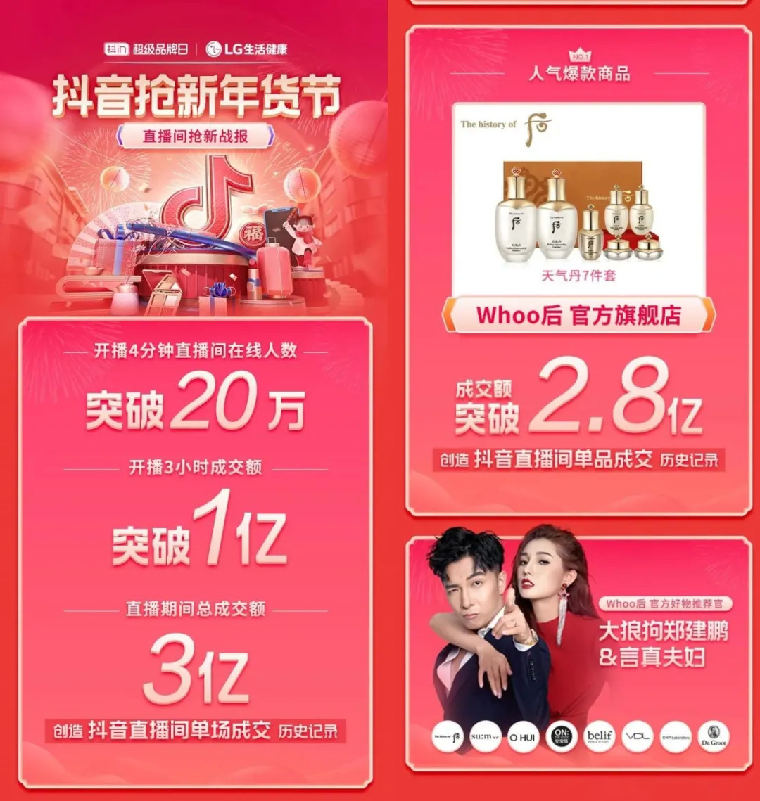 千万粉丝量级的短视频达人如大狼狗郑建鹏与言真夫妇、衣哥等,凭借短视频中成功的人设打造,吸引到了精准的粉丝群体和品牌方的注意,利用品牌专场直播的形式,一跃进入头部带货主播行列。近期,大狼狗夫妇的LG专场直播销售额突破3亿,成功打破抖音记录。