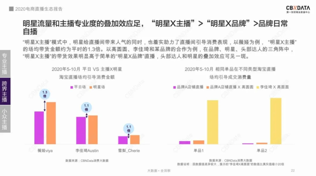 这种“明星X主播”的模式展现出了十足的吸金力。还是以薇娅直播间为例,报告显示,其有明星嘉宾坐镇的直播场次,场均带货金额约为平时的1.3倍。
