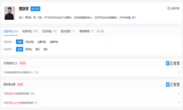 企查查显示,贾跃亭目前已身负30条限制高消费令,共60次被列为被执行人,当前被执行总金额超36亿元。