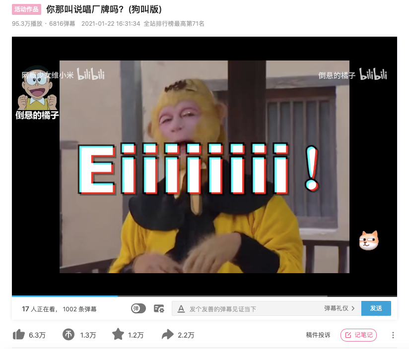 这可能也是《你那叫说唱厂牌吗?》能够引发出乎意料的二创风潮的原因——部分B站用户已经习惯于看到音乐类、说唱类内容,并且有很强的热情参与到内容创作中,哪怕不懂音乐不会说唱的用户,也会用“狗叫版”“猫叫版”参与到二创之中,这也是B站一直以来所强调的PUGV创作者生态发挥的作用。