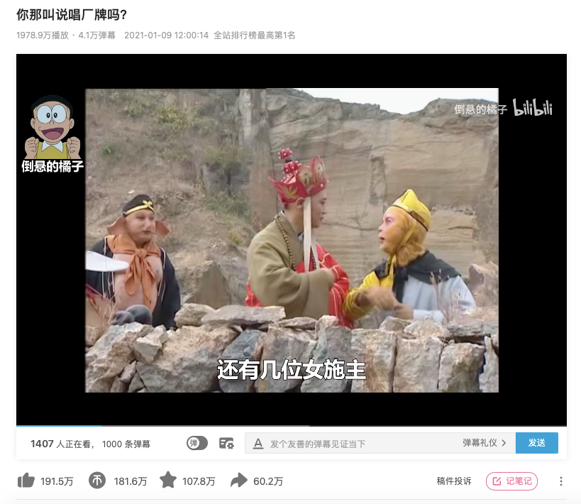用说唱的方式重新打开《西游记》,是鬼畜作品《大唐cypher》最亮眼的一点,师徒四人站在各自角度唱Rap,没想到“杀疯了”的是八戒,伴随着最后“注入灵魂”的熟悉唢呐旋律,UP主倒悬的橘子发布的鬼畜视频《你那叫说唱厂牌吗?》火遍了全B站,半个月时间播放量近2000万,用户直呼2021百大UP没橘子就冲了B站。