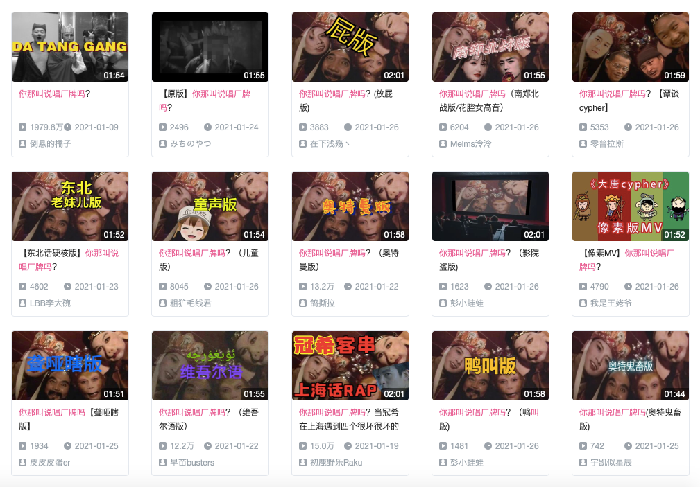 顺其自然的,这股观看热潮也带来了创作热潮,在原视频发布后,天津版、上海版、粤语版等方言版翻唱,英语版、韩语版、阿语版等国际版翻唱都一一出现,每出现一个新版本“离谱”都是B站用户的感叹,一个鬼畜视频带着用户学外语是没人能想到的。不过越是“离谱”就越是好玩,“狗叫版”的出现连“谱都没了”,但也不妨碍用户们看得乐呵,《你那叫说唱厂牌吗?(狗叫版)》视频如今也有了近百万的播放。