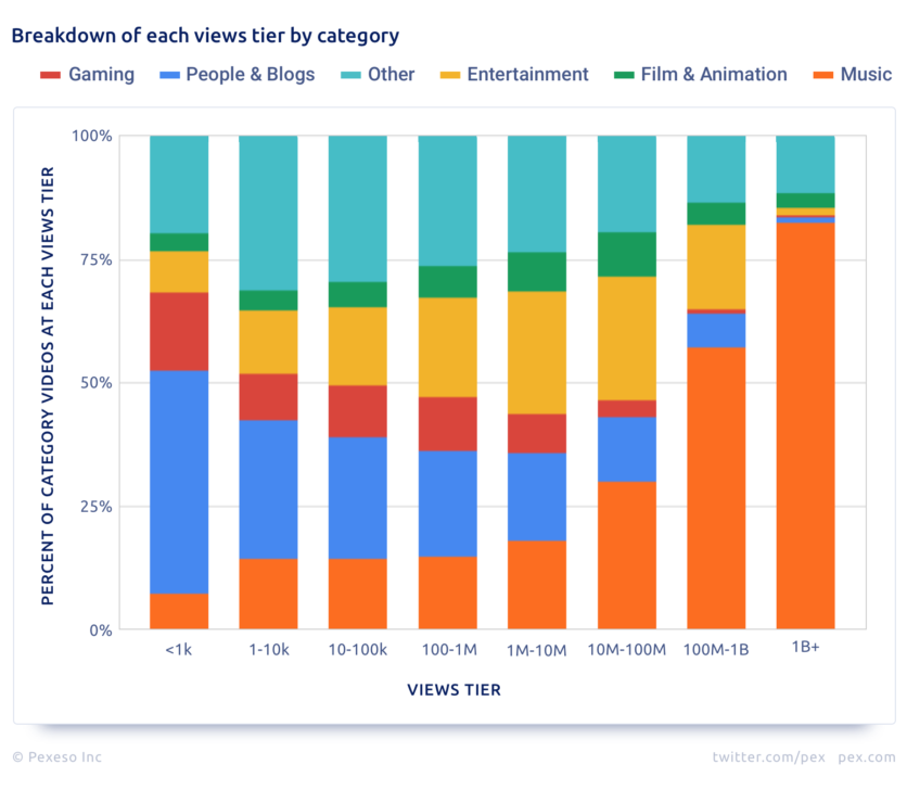 与索尼、环球合作让B站上有了众多专业向的MV视频,很容易让人联想到海外的YouTube,毕竟一直以来,MV都是YouTube上非常重要的内容:据分析公司Pex发布的2019《YouTube现状报告》显示,2019年平台上观看次数过10亿的视频中,音乐占比达83%,音乐内容每分钟观看次数为2944次,是娱乐内容次数的两倍,约为游戏内容的22倍。