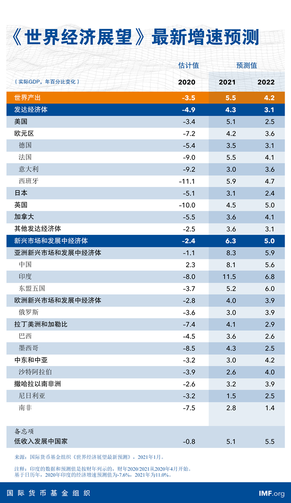 国际货币基金组织(IMF)周二发布的最新《世界经济展望》预计,全球经济在2021年和2022年将分别增长5.5%和4.2%。与去年10月发布的预测相比,IMF将2021年增速预期上调了0.3个百分点。该机构称,这反映出人们对疫苗有望推动经济走强的预期,以及几个主要经济体追加政策支持的影响。