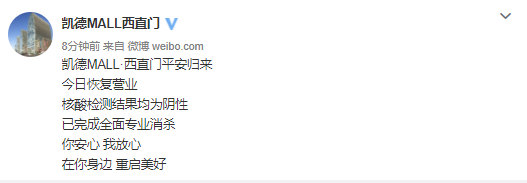 1月27日,北京凯德嘉茂西直门房地产经营管理有限公司官方微博消息,凯德MALL·西直门今日恢复营业,核酸检测结果均为阴性,已完成全面专业消杀。