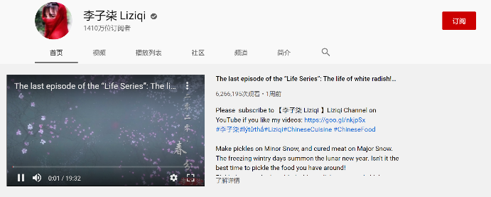 (李子柒油管主页,很多人在这里看到了“文化输出”)