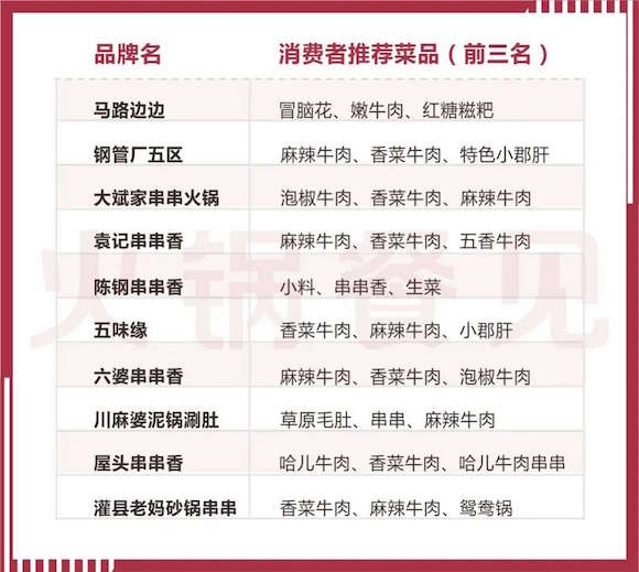 从下列各个品牌的“消费者推荐菜品前三名”,可以发现,串串店最常见的招牌菜是牛肉。