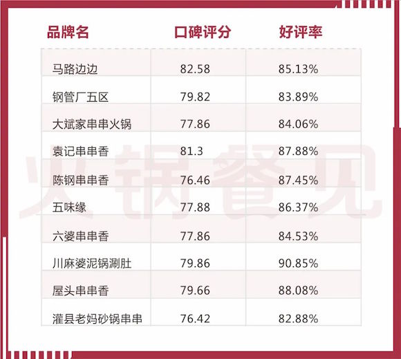餐见君整理了十大品牌的评分情况。从好评率来看,基本稳定在80%以上。但口碑评分不乐观,最高的是马路边边82.58,其次是袁记串串香81.3分,其他的均在70多分。