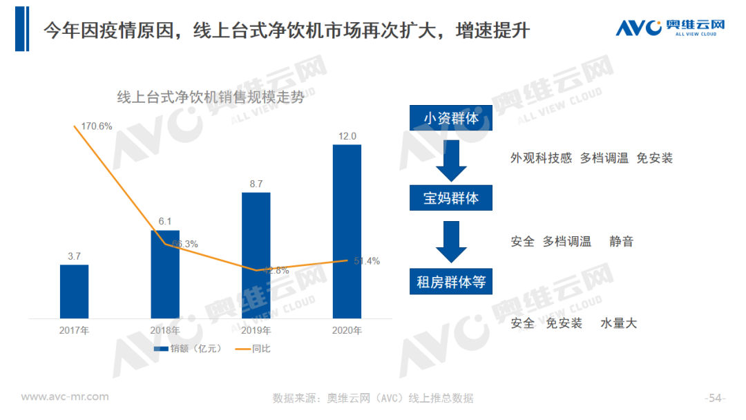 伴随着公众对饮水安全的关注,净水品类普及速率不断提升,在一、二级市场中净水器产品因18年、19年会销透支及需要上门安装等问题,阶段性遇顶。同时受到今年疫情小区封闭影响,免安装类的台式净饮机产品再次迎来增长契机,据奥维云网(AVC)推总数据显示,台式净饮机线上市场规模销售12亿元,同比增长51.4%,且台式净饮机购买人群与线上销售群体覆盖度高,线上占比达到81.6%。