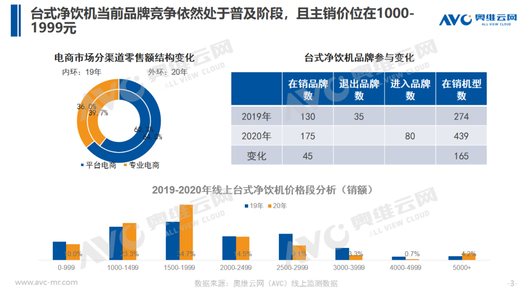 从当前竞争态势来看,受天猫在2020年独立端口对台式净饮机产品做资源倾斜影响,2020年台式净饮机平台电商占比扩大至64.0%。