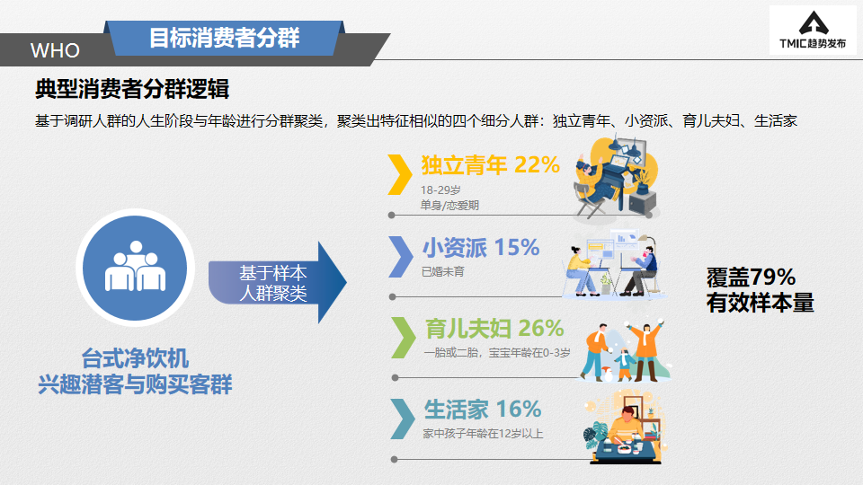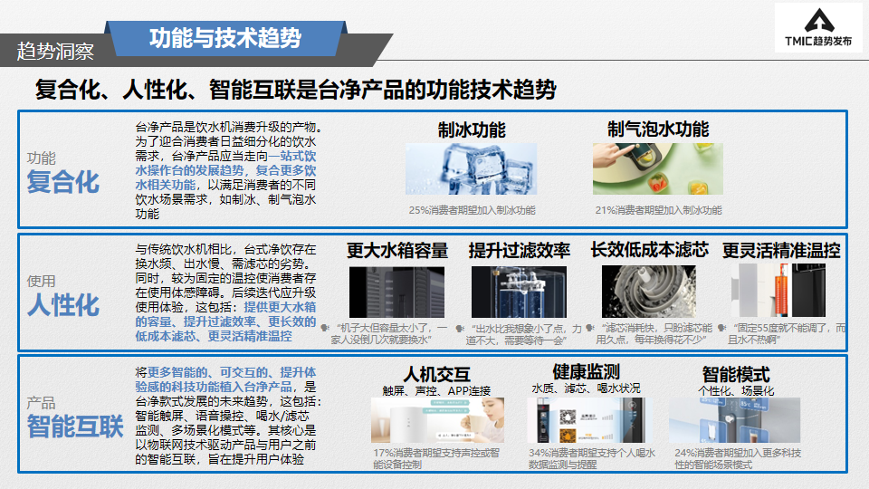 为了能更明确的分析台式净饮机增长动因,我们从天猫品牌日&TMIC趋势发布的《台式净饮水机白皮书》的部分内容可以看到净饮机目标群体特征及未来产品趋势。