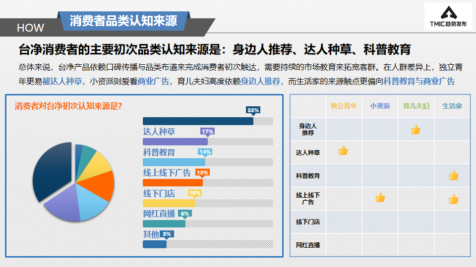 在信息接受层面,整体更倾向于身边人推荐,也就是口碑传播,其他层面如达人种草、线上、线下广告层面更被独立青年及小资派接受,这部分群体对流行因素接受度强,而育儿夫妇高度依赖于身边人推荐,对产品安全、性能关注度高,而生活家则对科普教育及上也广告接受度高,基本上以偏高端产品为主。