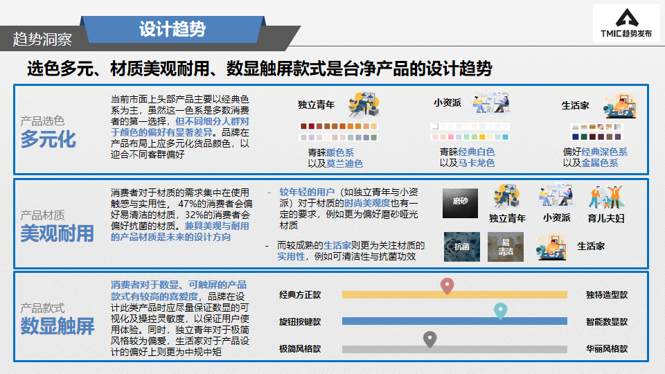 在产品设计层面,首先是在设计趋势,当前产品主要以经典色、耐用美观材质、旋钮或者触摸屏为主,从产品发展趋势来看,未来产品需要丰富SKU,在选色层面需要增加细分群体对不同色系的偏好,材质方面增加产品触感及抗菌等性能,产品款式层面普及触屏及数显等功能。