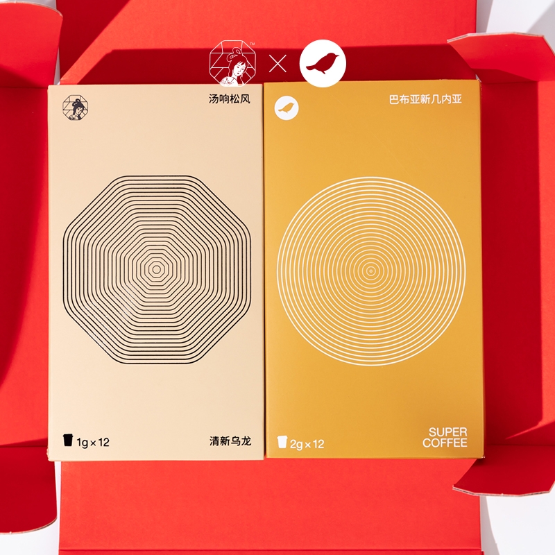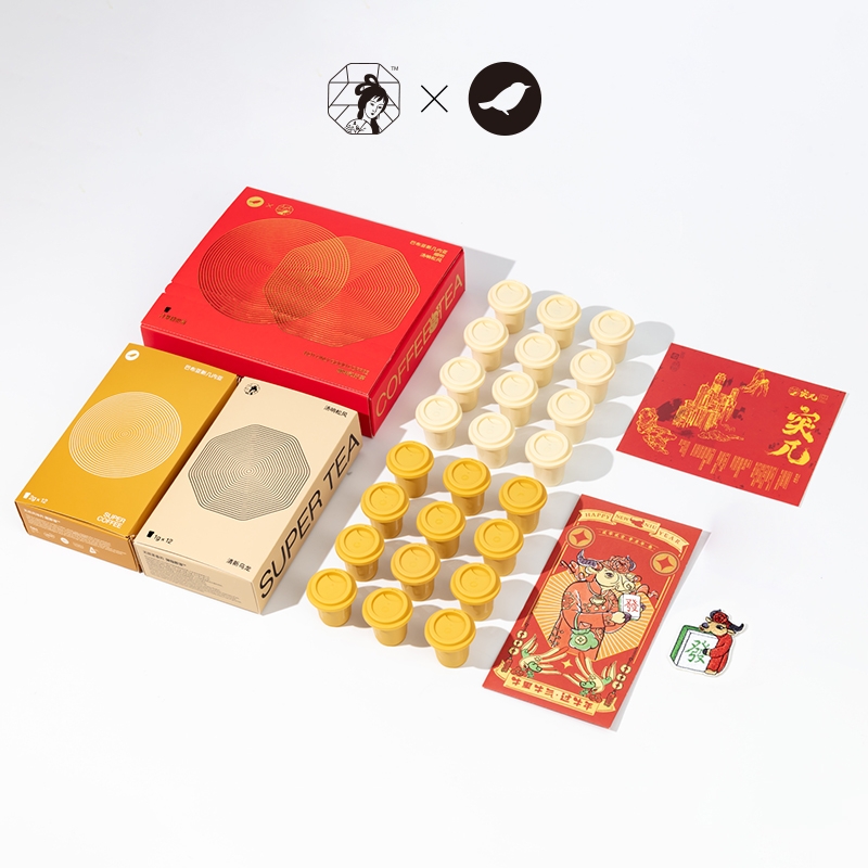 礼盒包含12枚茶颜悦色的“汤响松风”原叶冻萃茶,和12枚三顿半“巴布新几内亚”超即溶咖啡。原叶冻萃茶是茶颜悦色自主研发的新品,将乌龙茶用食品级冻干工艺转变成茶粉,让泡茶更方便,同时锁住茶叶的鲜香。原叶冻萃茶溶解快,且冷热水都可泡,可直接用矿泉水冲泡成一杯鲜茶,也可加入牛奶DIY一杯奶茶。