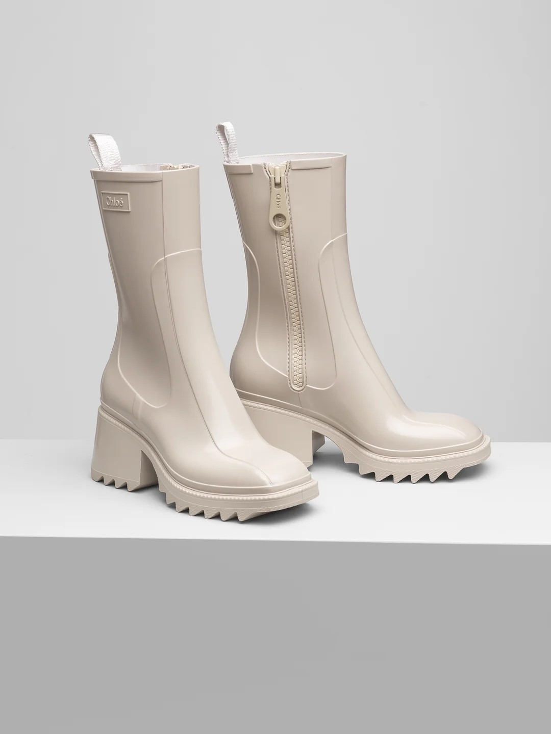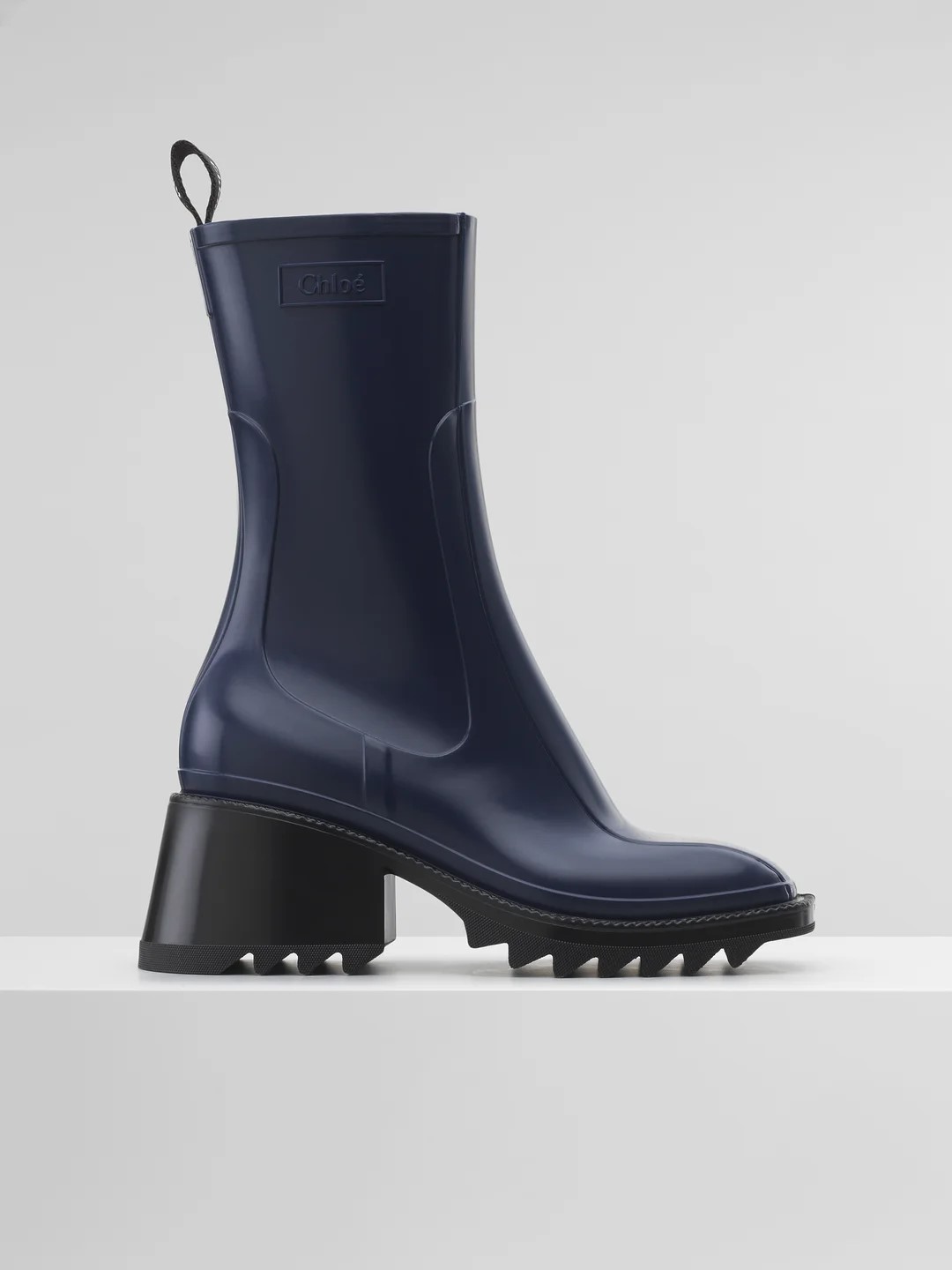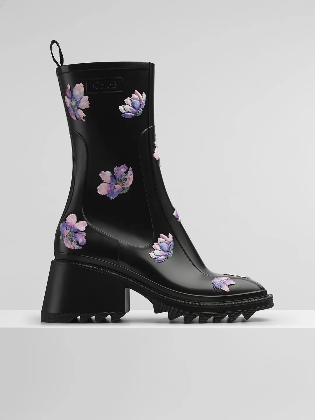 Betty雨靴由PVC材料制成,鞋面光亮结实,呼应经典皮靴风格,并融合品牌标志性鞋型轮廓。原创超大后跟带饰有Chloé品牌标识,内部拉链扣确保廓形柔美。短小扁平的方形鞋跟大胆醒目的沟纹鞋底,则为这款惠灵顿雨靴带来前卫气息。