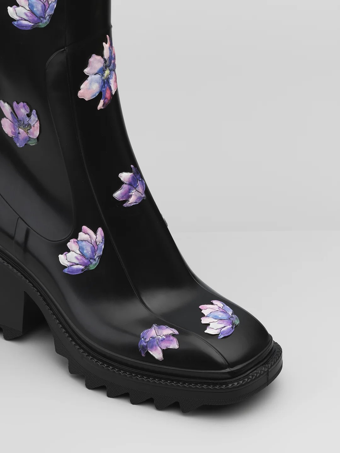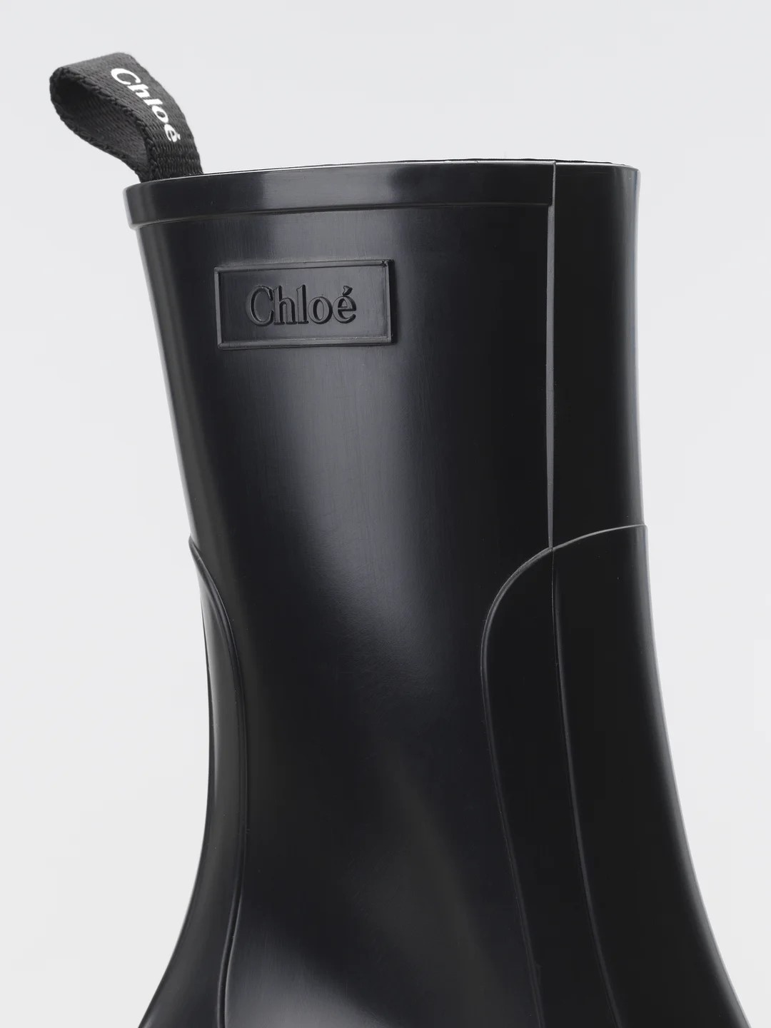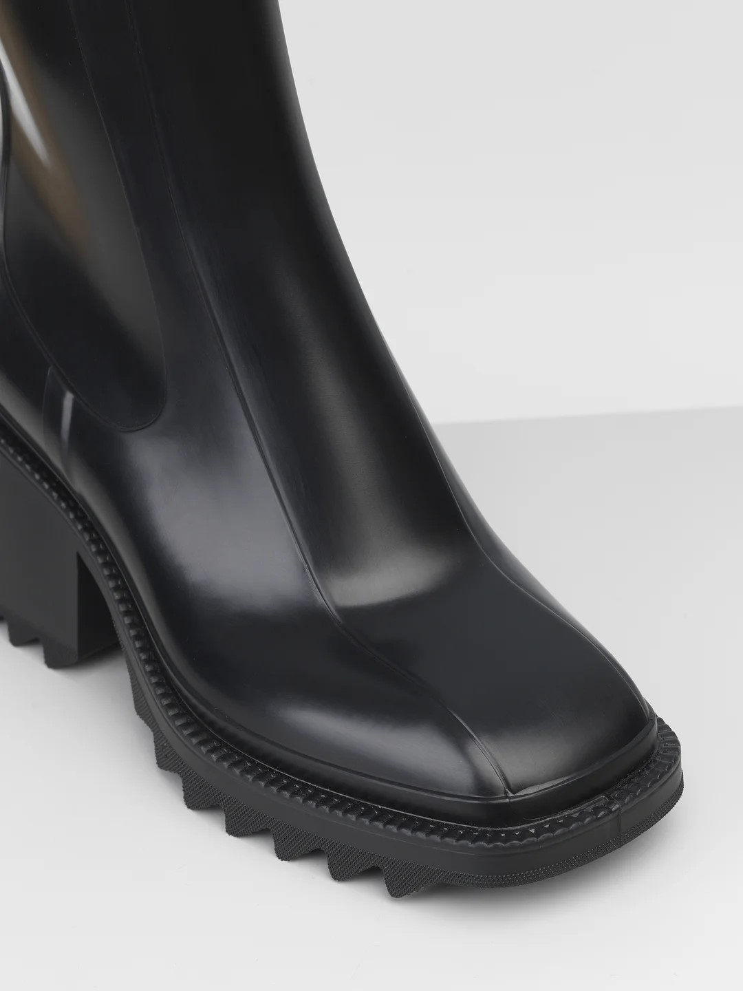 Betty雨靴由PVC材料制成,鞋面光亮结实,呼应经典皮靴风格,并融合品牌标志性鞋型轮廓。原创超大后跟带饰有Chloé品牌标识,内部拉链扣确保廓形柔美。短小扁平的方形鞋跟大胆醒目的沟纹鞋底,则为这款惠灵顿雨靴带来前卫气息。