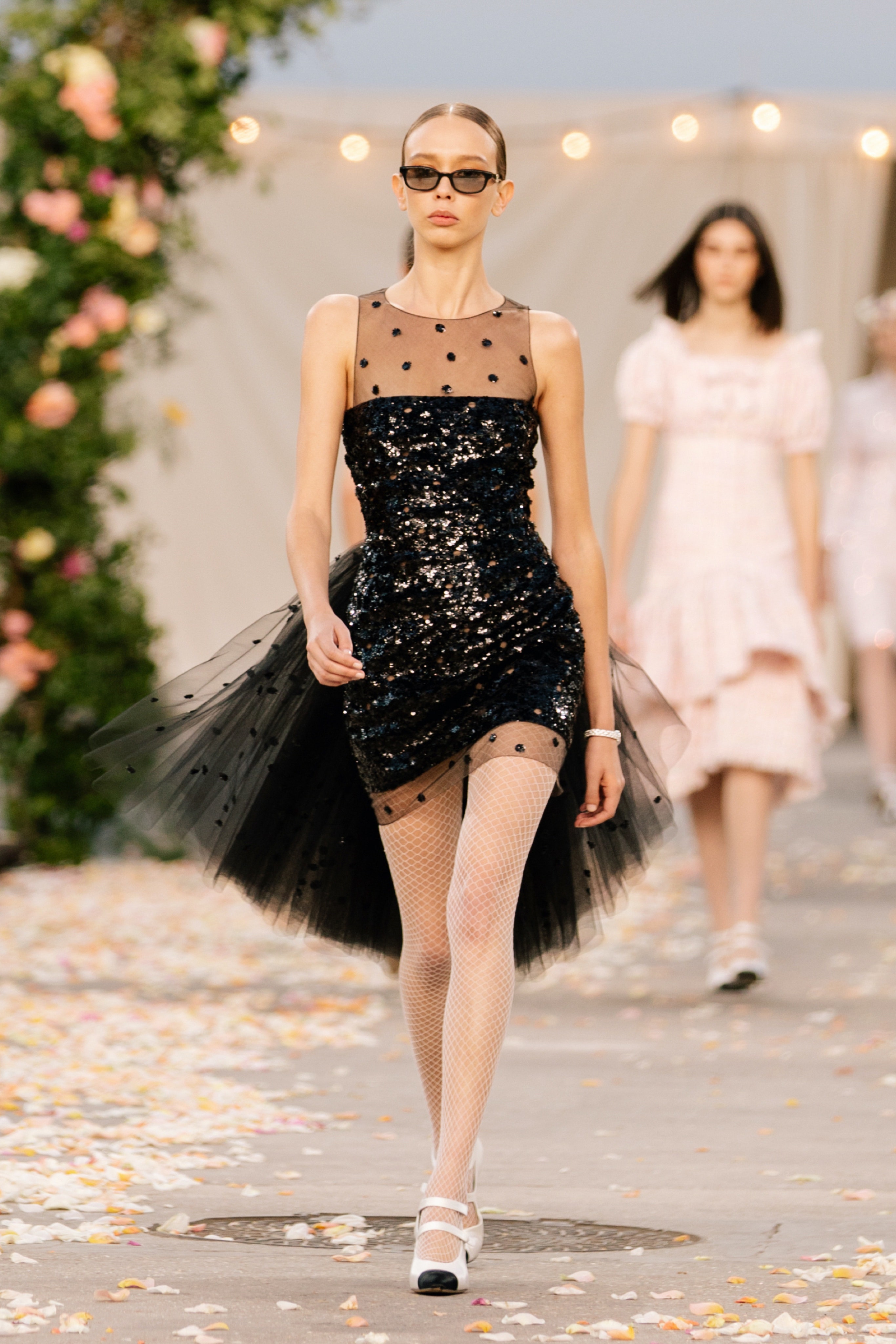 最明显便是对香奈儿经典呢绒面料的再改造。自Virginie Viard上任后,这种看起来颇为沉稳的面料就像被剥了一层皮,变得更轻更薄,同时也更年轻。青涩的浅粉色和薄荷绿色镶边也为这种轻盈感贡献不少,形成一种形似麦穗粗糙边缘的视觉效果,与悠闲的南法风格颇为契合。