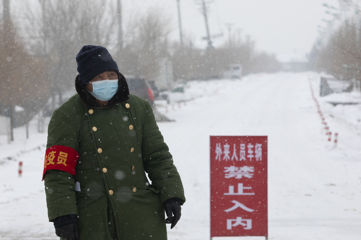 1月20日,工作人员在黑龙江绥化市北林区宝山镇永发村村口执勤。(张涛 摄)