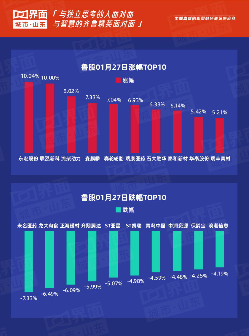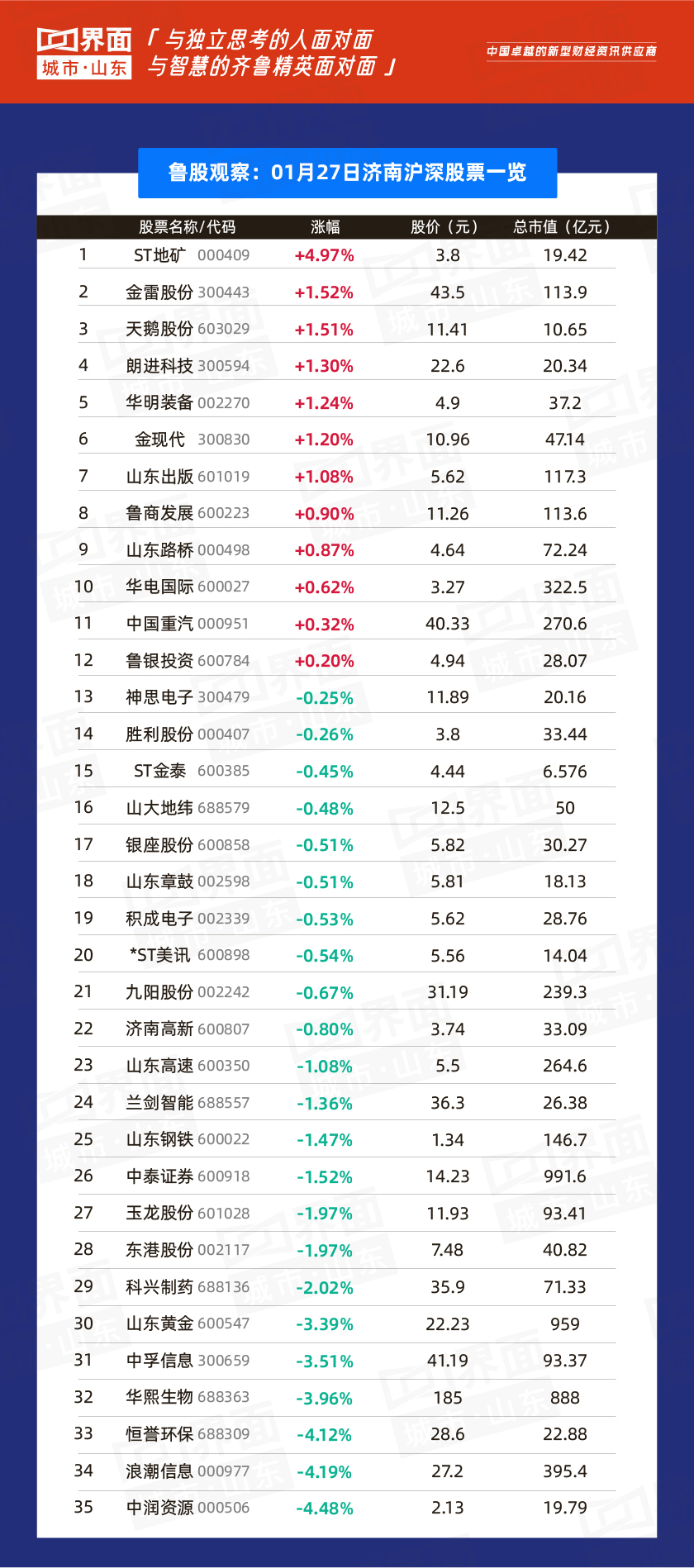 受大盘影响,1月27日,山东100只股上涨,109只股下跌,16只股持平。