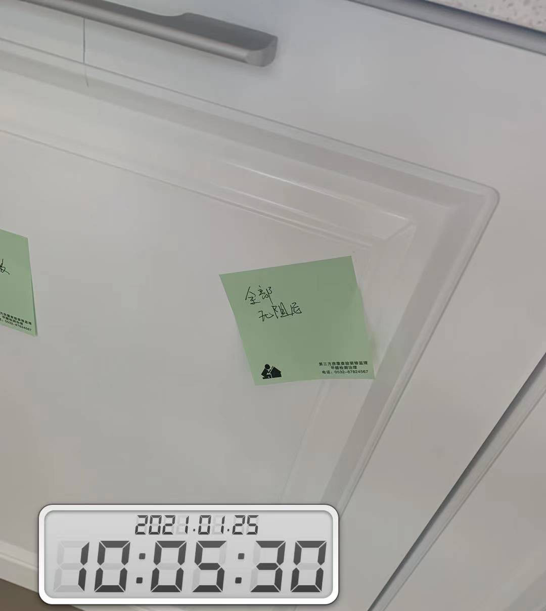 其中,客厅西墙木制作南侧钉眼未修复1处且西墙木制作北侧上方、下方各一处破损;厨房橱柜所有柜门未装阻尼,油烟机上方柜门关闭不严;西南卧门口处压条与木地板闪缝,南墙中间下方踢脚线拼接不严;阳台过门石裂纹1处;主卫顶面东侧铝扣板拼缝过大,洗手盆下方柜门无阻尼,镜柜柜门关闭不严;暖气片上水管未收口;公卫过门石划痕、裂纹各一处,洗手盆下方柜门未装阻尼,暖气片上水管未收口。