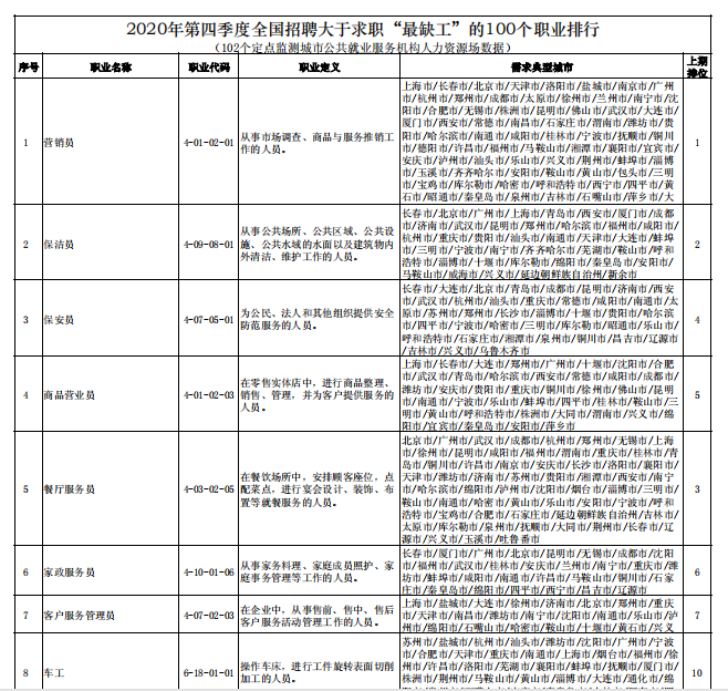 1月26日,人力资源和社会保障部发布2020年第四季度全国招聘大于求职“最缺工”的100个职业排行,排名前十的职业分别为:营销员、保洁员、保安员、商品营业员、餐厅服务员、家政服务员、客户服务管理员、车工、房地产经纪人、焊工。