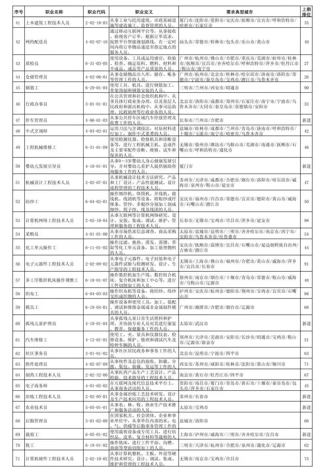 同时,人社部也指出,在疫情防控常态化条件下,社会管理和社会服务事业人才需求加大。 “保卫管理员”“保安员”“社区事务员”等职业排位上升。“家政服务员”位列前十,“保育员”“养老护理员”排位上升,“婴幼儿发展引导员”“孤残儿童护理员”首次进入排行,“幼儿教育教师”重新进入排行,“中学教育教师”排位上升。