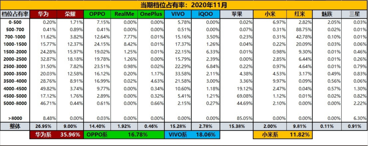 在K30热销的2020年(截止到2020年11月),小米累计占有率9.9%,累计同比增长-14.5%;在1000元以内区间,成为了小米系的份额增长的全部来源,且这一区间全部是红米的增长,红米的份额已经增长到59%。小米10系列的销量,仅仅比同期小米9系列增长了4.7%。