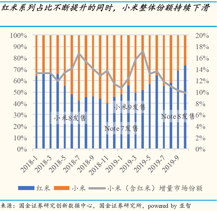 而红米的低价策略,直接或者间接的,透支了小米品牌的品牌力,正如卢伟冰所说,红米的低价,压缩了小米的品牌空间。更为甚者,小米集团手机的出货量中,红米成为了绝对的主力。以国金证券发布的报告来看,红米的实际出货量,已经达到小米手机业务的三分之二,这对“红米放量”后追求性价比而离开小米的断言,是完美的印证。