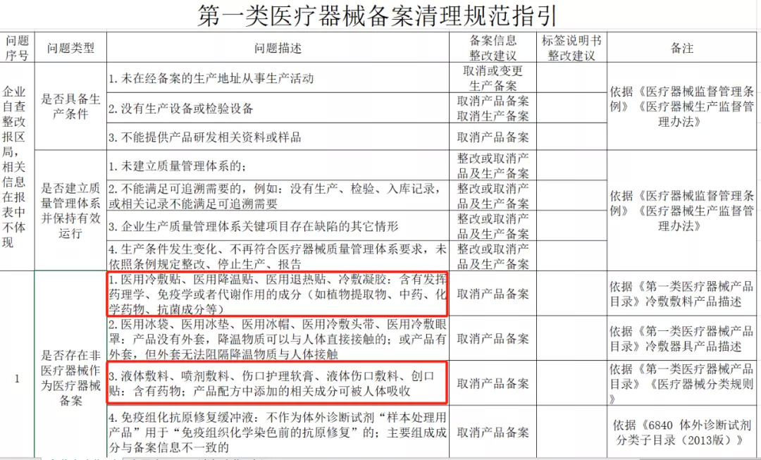 广州花都发布的《第一类医疗器械备案清理规范指引》(下称:指引)提到,此次要求企业自查主要是为了梳理清楚,企业是否具备生产条件、是否存在非医疗器械作为医疗器械备案等8大类问题。根据企业存在的问题,依据医疗器械的有关规定取消产品或生产备案,又或是督促企业整改或取消产品及生产备案。