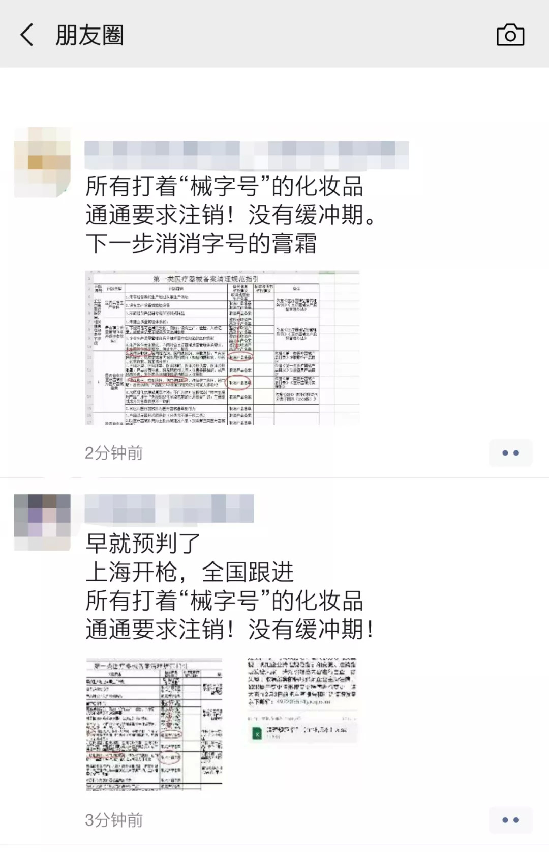 昨日晚间,有多位业内人士在朋友圈发文称,“所有打着‘械字号’的化妆品通通要求注销,且没有缓冲期。”