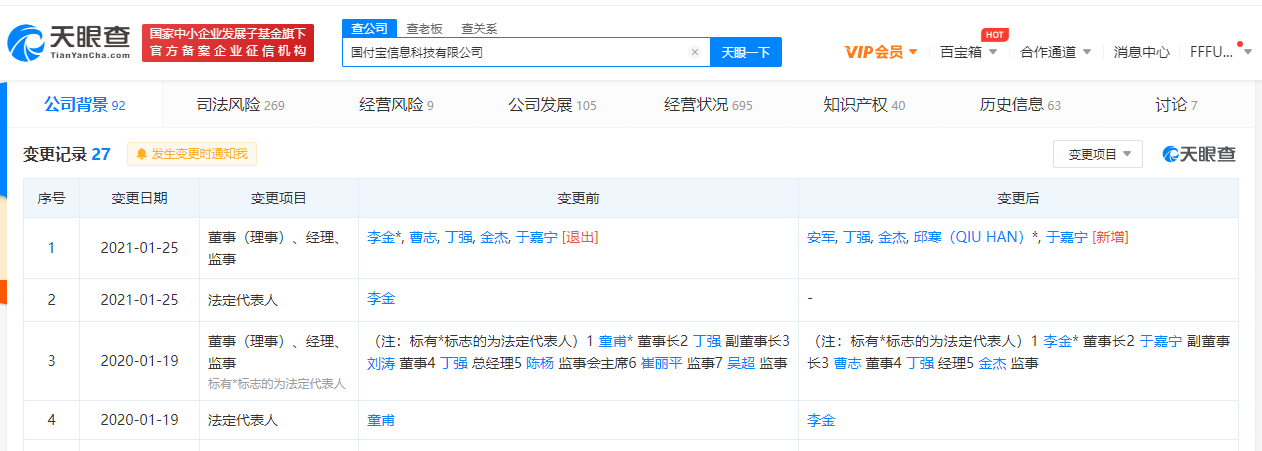 据天眼查APP显示,1月25日,Paypal关联公司国付宝信息科技有限公司发生工商变更,原法定代表人李金退出,由邱寒接任。同时,该公司董事(理事)、经理、监事变更信息显示,李金、曹志退出,新增邱寒、安军。天眼查APP显示,国付宝信息科技有限公司由PayPal全资持股。