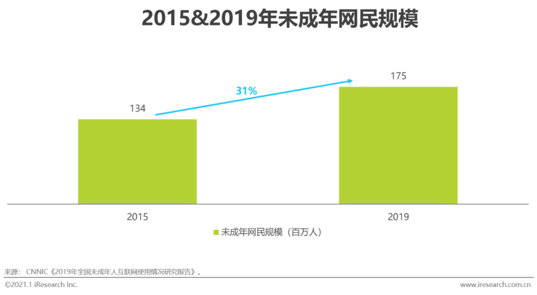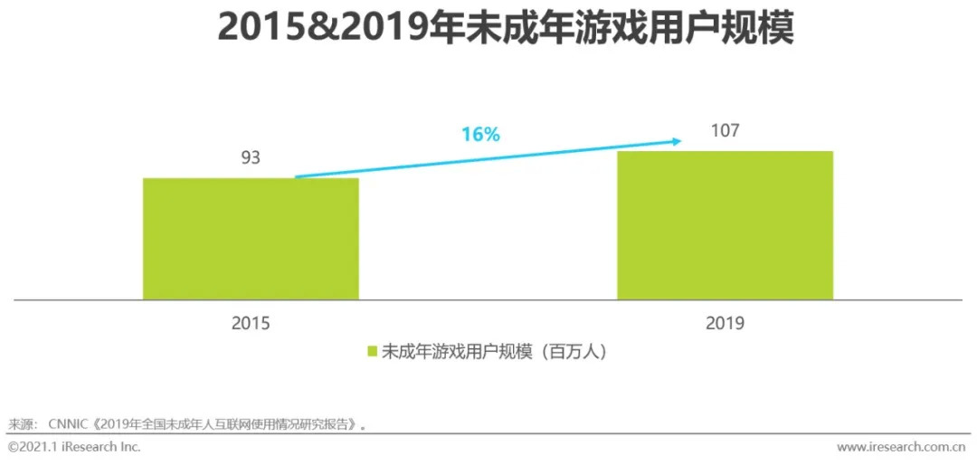 根据共青团中央维护未成年人权益部与CNNIC于2020年5月发布的《2019年全国未成年人互联网使用情况研究报告》,2019年中国未成年网民规模达到1.75亿,未成年人互联网普及率已经达到93.1%,相较2016年CNNIC《2015年中国未成年人上网行为研究报告》中发布的数据,4年间,未成年网民规模上升了0.41亿,增幅约为31%。艾瑞咨询通过对CNNIC中国未成年人上网行为研究报告系列中发布的数据进行推算,估算2019年中国未成年游戏用户规模约为1.07亿人,较2015人年的0.93亿人上升0.15亿,增幅约为16%。随着互联网在未成年中的渗透率逐渐接近饱和点,预计未成年游戏玩家的人数增长也将进一步放缓。