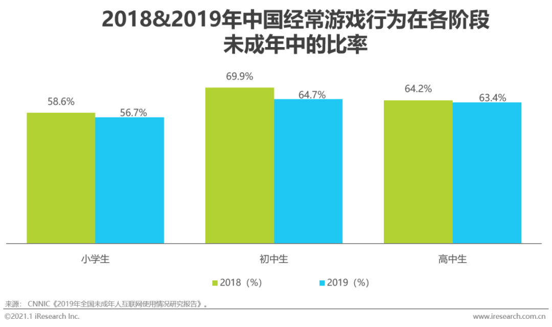 根据CNICC发布的《2019年全国未成年人互联网使用情况研究报告》,在未成年人上网经常从事的各类活动中,选择玩游戏的未成年人比例达到61%,在休闲娱乐活动中的选择率仅次于听音乐的66%。游戏行为在未成年人中较为普及,已成为他们的主要休闲活动。值得注意的是,经常游戏行为在小学生、初中生和高中生人群中的渗透率差异在2019年逐渐弥合,且三者渗透率出现了不同程度的下滑。