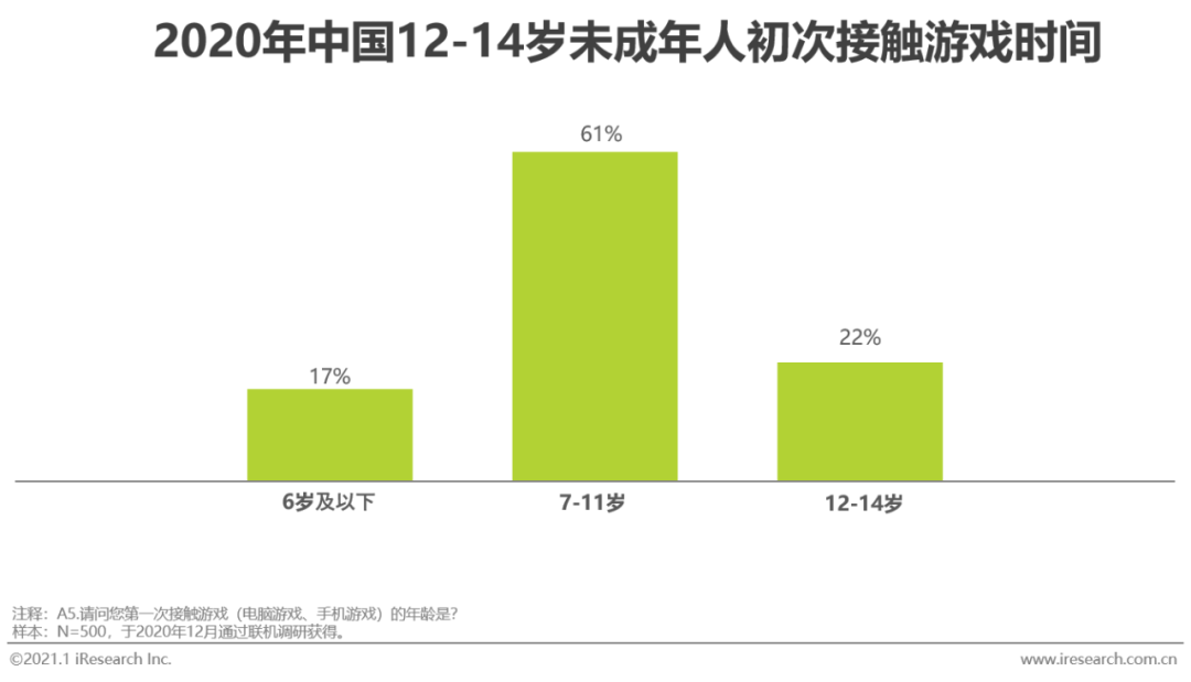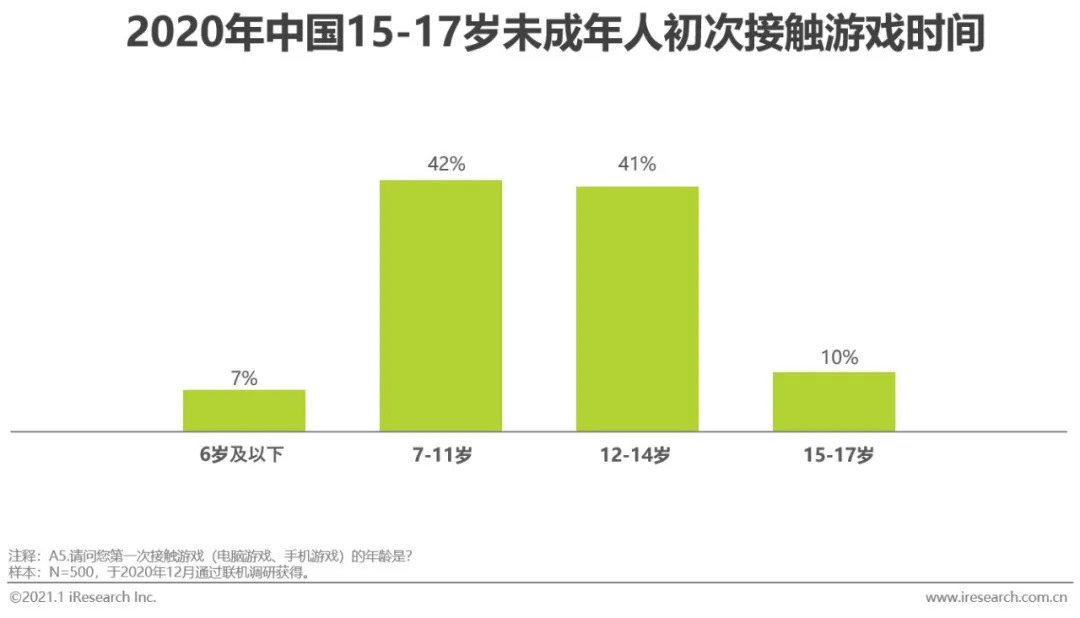 根据调研,未成年人首次触游年龄下降较为明显。2020年,15-17岁有游戏习惯的未成年人约有49%在11岁前初次接触网络游戏,而在12-14岁年龄段,这个比例升至78%。受电子设备的普及和社会客观条件变化的影响,未成年人首次接触网络游戏时间向低龄化发展。