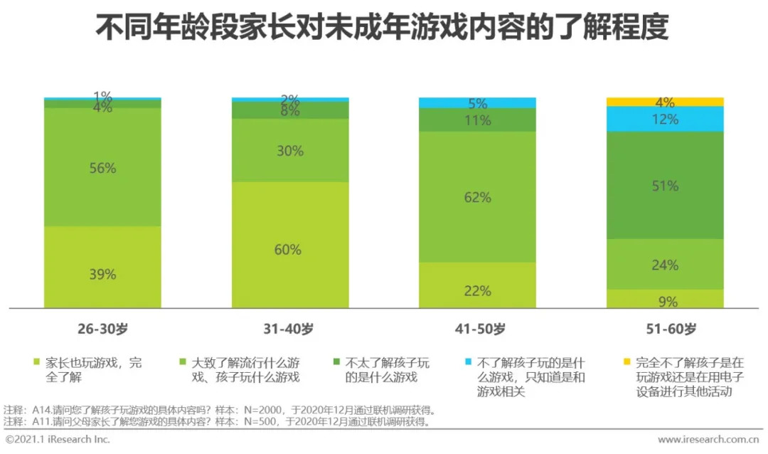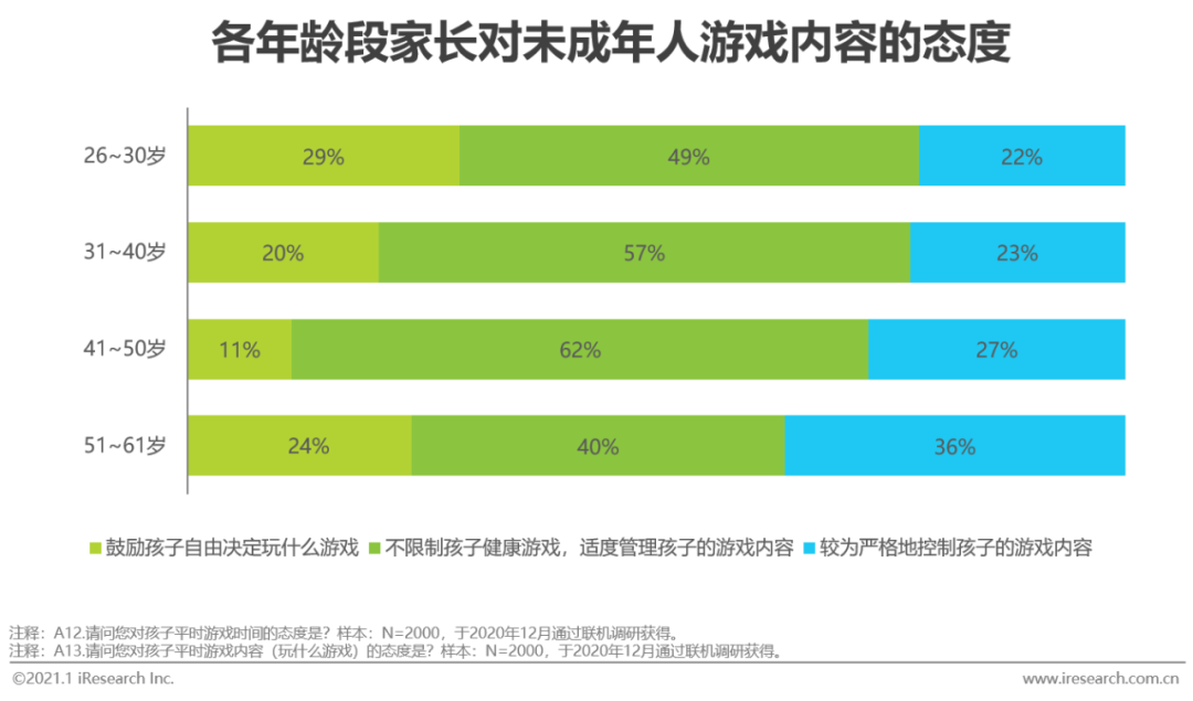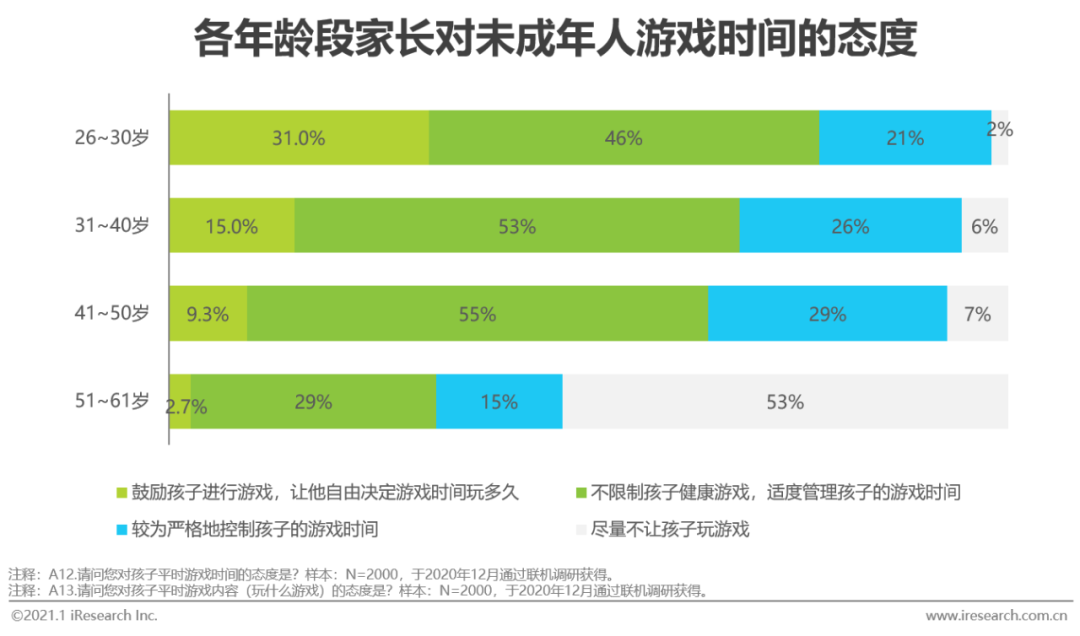 根据调研,不同年龄段家长对青少年的游戏时间及游戏内容态度都呈现出年长者较为谨慎、年轻者相对宽松的整体格局。其中,超过五成51-61岁的家长选择尽量不让未成年人玩游戏,可能原因除了家长本身对游戏存在一定偏见,还可能因为这个年龄段家长的孩子都处于升学阶段,不希望游戏影响孩子学习。