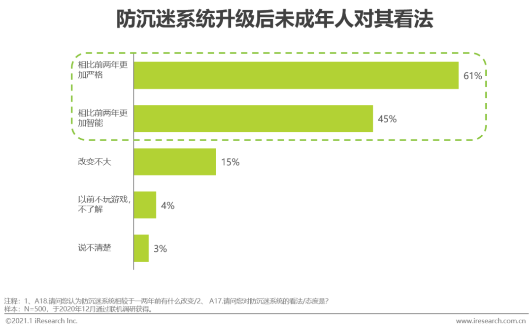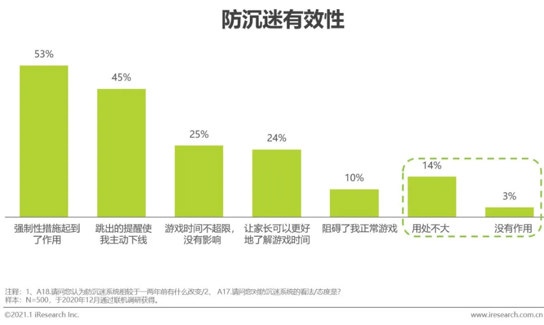 未成年人总体对防沉迷系统的有效性给出了正面评价.对于防沉迷措施整体升级后的表现,半数左右的未成年人都认同系统相对过去更为严格、智能。而对于直观效果,认为防沉迷系统用处不大或没有作用的未成年人比例分别只有14%和3%。