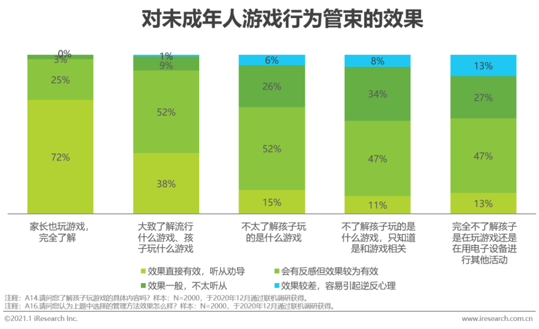 根据调研,管束效果与家长对游戏认知程度呈现出较强的关联性。结合管束方法,可以发现家长对于未成年人游戏内容越了解,越倾向于使用软性手段进行游戏的管控,就可以更切实有效控制未成年人的游戏时间。这部分家长对游戏行为相对宽,与孩子拥有共同话题,以同为游戏玩家的身份或从尊重未成年人喜好的角度出发,能够更好地沟通合理游戏时间的重要性并与未成年人达成“共情”,起到较好的管束效果。