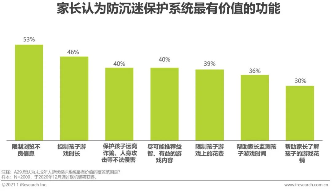 根据调研,家长认为防沉迷保护系统中最有价值的功能主要是各类被动限制,排名前三的选项分别是:对筛除不良信息、控制游戏时长以及保护孩子远离不法侵害。相较被动限制,能让家长进行主动监测的功能则不太被家长注重,协助家长监测孩子游戏时间及付费的功能位列末尾。