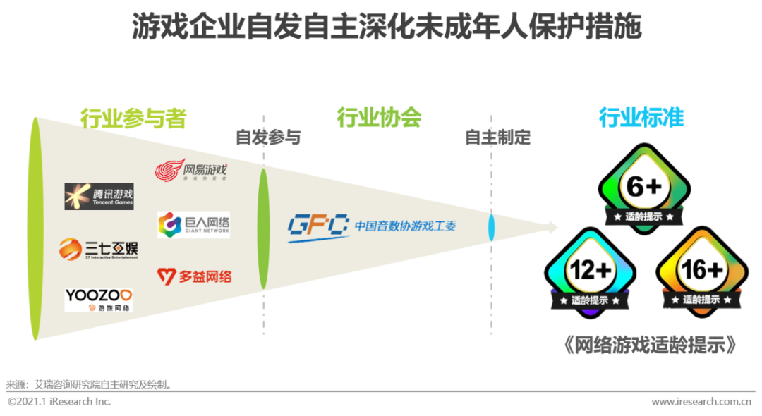 行业参与者在各主管部门牵头下,本着切实保护未成年人、健康发展游戏产业的宗旨,主动加入如音数协游戏出版工作委员会等行业组织,积极深化落地各项国家法律法规的要求和方针。2020年12月16日,在中宣部出版局的指导下,由中国音数协团体标准化技术委员会立项,腾讯、网易、三七互娱、人民网等企业单位牵头开展的《网络游戏适龄提示》正式发布,为不同年龄段未成年人制定了对应的标准规定,象征我国国内针对未成年人的游戏分级标准在全行业的推动下,向前迈出了坚实的一步。新标准计划将与身份认证、家长监护等未成年人保护政策紧密关联,将自发的企业社会责任与现有的法律法规相结合,为适龄提示标准的应用落地提供可靠的法规支撑和技术保障。