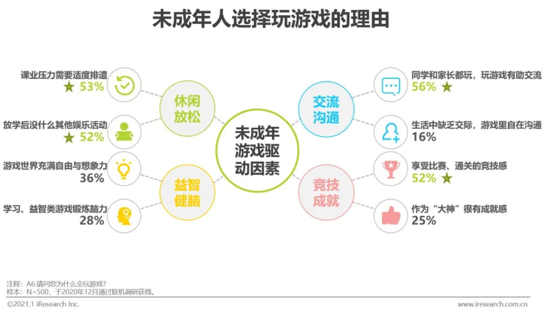 家长及社会对未成年人游戏行为的关注主要集中于游戏时长和游戏花费的定量指标上,却容易忽视他们为何进行游戏的定性因素。从未成年人自己的视角出发,休闲放松、交流沟通及竞技成就成了他们玩游戏的主要驱动。而这也与这个群体学习压力大、渴望与他人交流及需要成就感的年龄特征相符。