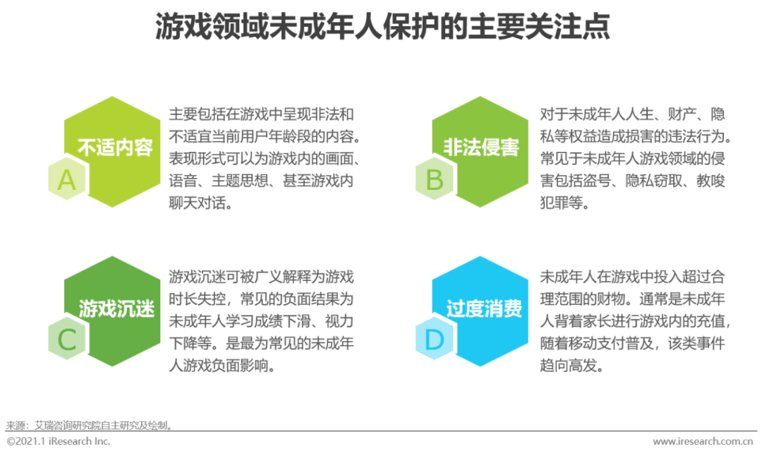 未成年人游戏行为与成人游戏行为本质没有区别,主要出发点都是通过适度游戏进行休闲放松。然而由于部分未成年人对其行为缺乏正确的认知及足够的自制能力,易受到游戏直接或间接的损害。依照近年来屡见于媒体报道的未成年人游戏负面事件,以及监管层及游戏企业实行各类保护措施的动向,可将游戏领域未成年人保护的主要关注归纳为以下四点: