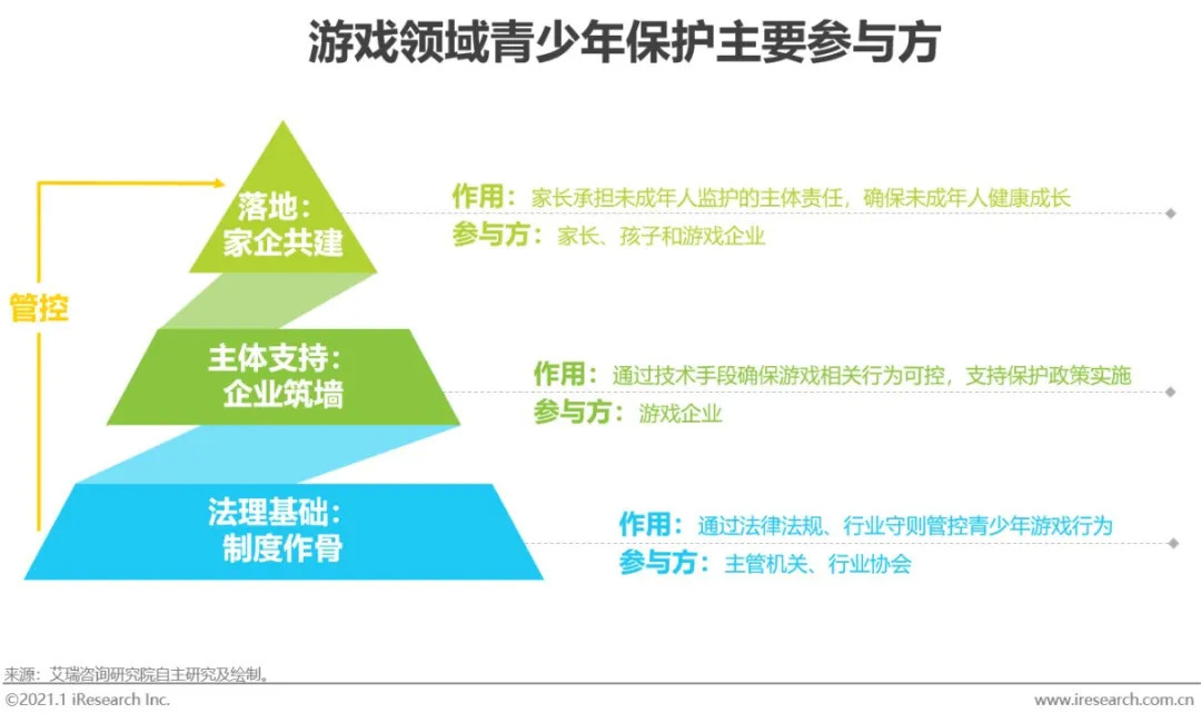 游戏领域的未成年人保护主要分为三个层次:法理基础,主体支持及应用落地;这三者分别对应了三个责任主体:政策制定者、行业参与者以及监护人责任主体。整体流程为主管部门对游戏企业提出强制或指导性规定,游戏企业依规建立起对应的控制保护制度,家长结合企业提供的技术工具管控未成年人游戏行为,三方合力起到确保未成年人健康成长的作用。