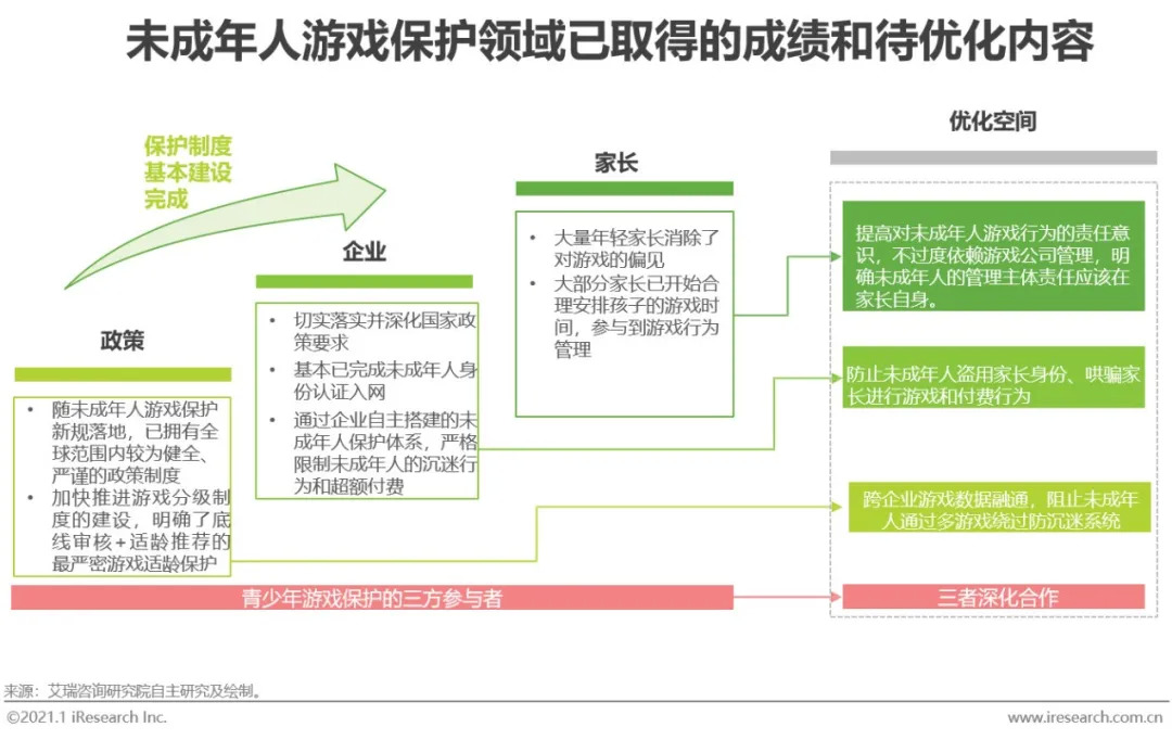 经过近15年的制度建设,中国未成年人游戏保护已经取得了长足的进步,在法理和实践上都已处于国际领先的地位。这份成绩与游戏企业的积极配合、自主深化是密不可分的,同时家长也开始对未成年人游戏行为产生正确的认知。总体来看,我国青少年游戏保护已见成效。然而由于行业数据不互通、家长责任意识薄弱等因素,未成年人游戏保护仍存在优化空间。