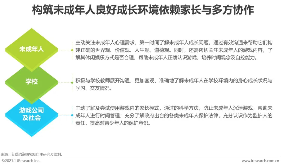 作为监护人,家长承担着关注未成年人的心理需求、帮助他们构建正确世界观的责任。游戏行为作为未成年人需求的一部分应该合理可控,但不代表仅关注未成年人游戏行为就足以支持未成年人的健康成长。大量案例表明,未成年人游戏行为失控其实是其生活中缺乏某些其他关键因素,而非仅仅是限制环节的失效。家长应该从生活各个方面入手,主动关注未成年人需求,与学校保持密切沟通,同时主动了解并学习使用科学的游戏家长模式,帮助未成年人正确认识游戏活动。