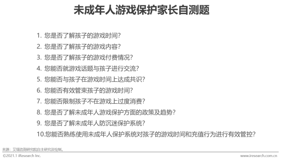 根据调研结果及家长关注的内容,我们总结出十道题作为家长对未成年人游戏行为把握程度的参考,同时家长也可根据自测题查漏补缺,进一步提升未成年人游戏行为方面的保护。
