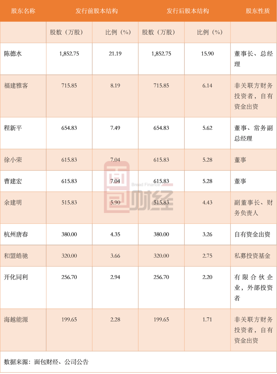 公司的股权分布较为分散,截至招股书签署日,公司控股股东及实际控制人为陈德水、余建明、程新平、徐小荣四名自然人。上述股东直接持有公司发行前总股本的41.63%,并通过控制开化金悦,合计控制公司发行前总股本的43.54%。发行前,公司前10名股东共计持股比例为70.08%: