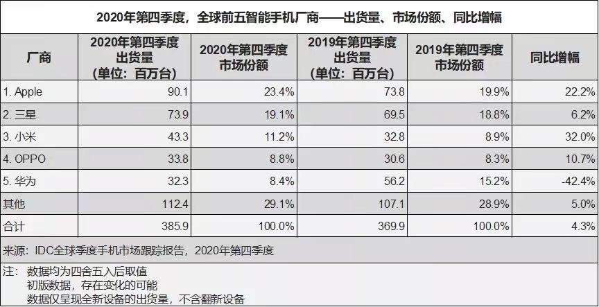 近日,多家数据机构公布了2020年第四季度全球智能手机市场情况。
