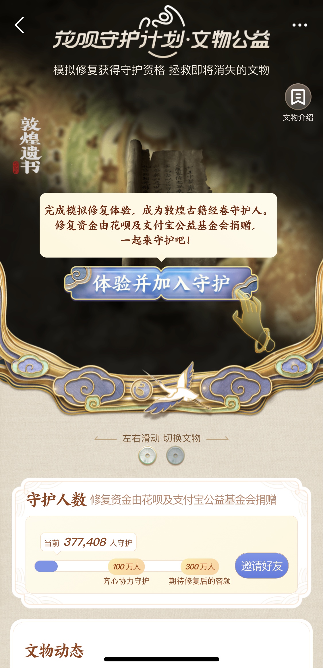 除可自主管理额度外,界面新闻发现,近期花呗还上线了“花呗文物计划”。在这一功能中,用户可以自己成为“守护人”,也可以邀请好友参与。