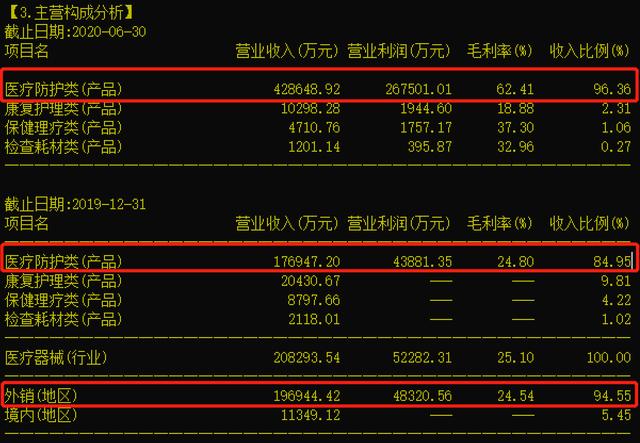 前面提到,疫情导致的主营产品价格上涨,是英科医疗业绩大增的主要原因。从业务结构看,核心的医疗防护产品居功至伟,其2019年占营收比例为84.95%,2020年中报又进一步增加至96.36%。不仅如此,2019年境外业务占公司总营收的94.55%,联系到海外的疫情进展,对业绩的影响就不言自明了。